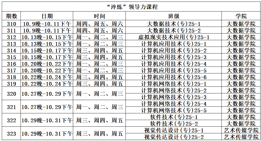 为有序推进我校各部门教育教学开展,便于各部门教师顺利落实教学工作,现将我校10月份素质拓展训练与“淬炼”领导力课程的安排公布,请各位老师及时查阅,并做好调停课安排。具体如下: