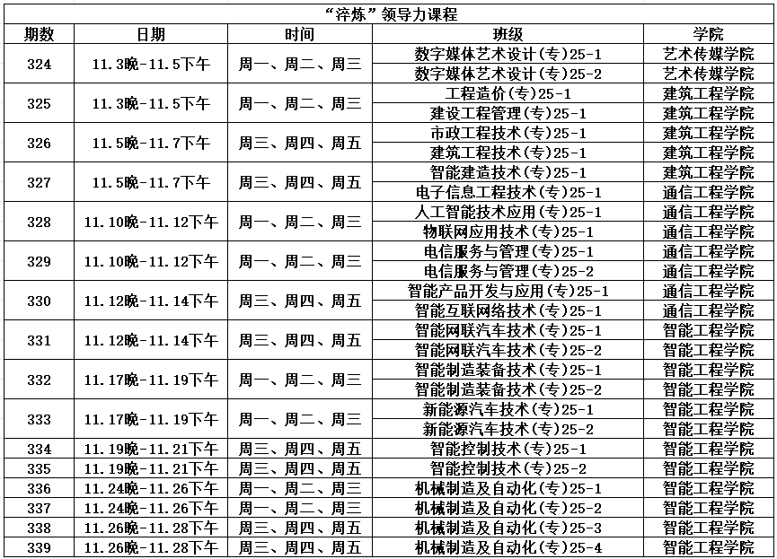 为有序推进我校各部门教育教学开展,便于各部门教师顺利落实教学工作,现将我校11月份素质拓展训练与“淬炼”领导力课程的安排公布,请各位老师及时查阅,并做好调停课安排。具体如下: