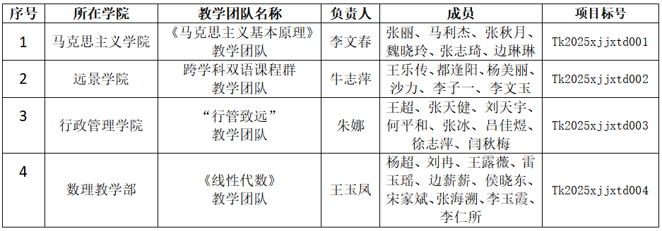 根据《泰山科技学院教学团队建设与管理办法(试行)的通知》文件精神,经部门初选、专家组评议、学校审议、校内公示等环节,现公布泰山科技学院2025年校级教学团队项目立项名单: