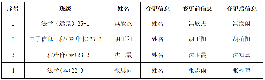 根据教育部关于印发《高等学校学生学籍学历电子注册办法》(教学[2014]11号)规定,经学生申请、学校审核,初步同意以下学生学籍信息修改申请,现公示如下。