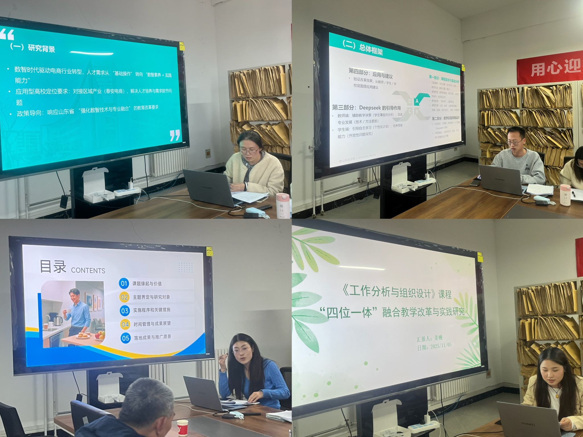 会议核心论证环节分“项目汇报”与“专家点评”两步有序推进。第一阶段,教改项目负责人依次通过PPT汇报,聚焦研究背景、研究目标、核心内容、实施路径、预期成果及创新点展开详细阐述。汇报项目紧扣时代教育发展需求,涵盖数智时代人才培养、OBE理念课程改革、课程思政融入、协同育人机制创新等多个维度,既贴合应用型高校办学定位,又凸显商科教育特色。