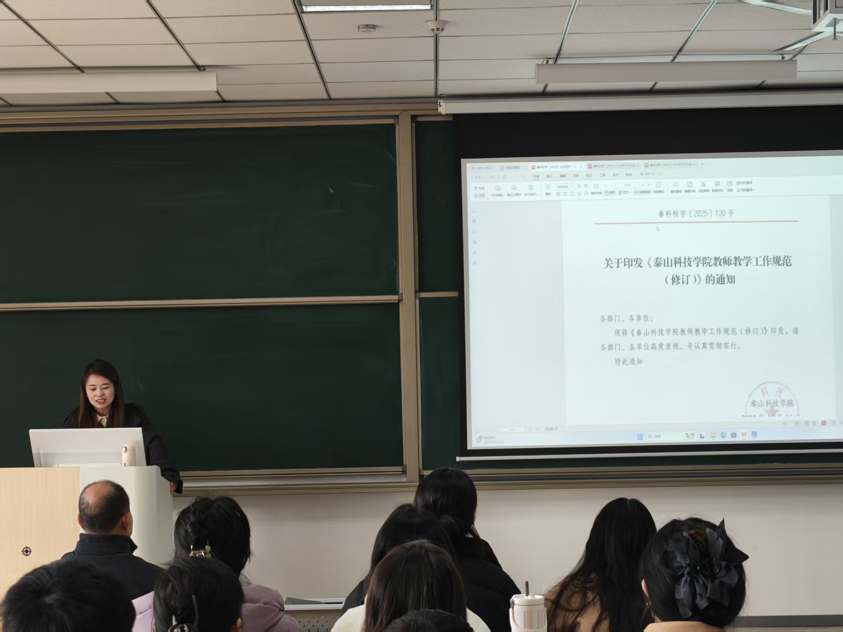 会上,杨超围绕《泰山科技学院教师教学工作规范(修订)》《课程考核管理规定(修订)》《教学事故认定及处理办法(修订)》三份核心文件,结合数学学科教学特性展开系统解读。在教师教学工作规范学习环节,重点梳理备课、授课、实践教学、辅导答疑等关键环节的实施要求,明确数学课程教案编写需突出逻辑推导过程,例题设计要兼顾典型性与应用性,强调需依据学生数学基础差异精准落实因材施教。针对课程考核管理规定,聚焦命题规范、成绩评定、缓考补考等核心内容,明确数学类课程必须严格遵循“教考分离”原则,命题需全面覆盖基础知识、逻辑推理与综合应用等维度,且A、B卷重复率不得超过20%。在教学事故认定部分,结合数学课堂教学与考试场景,对擅自调课、命题失误、成绩登载错误等常见事故类型及对应处理标准进行重点警示,提醒全体教师严守教学纪律底线。
