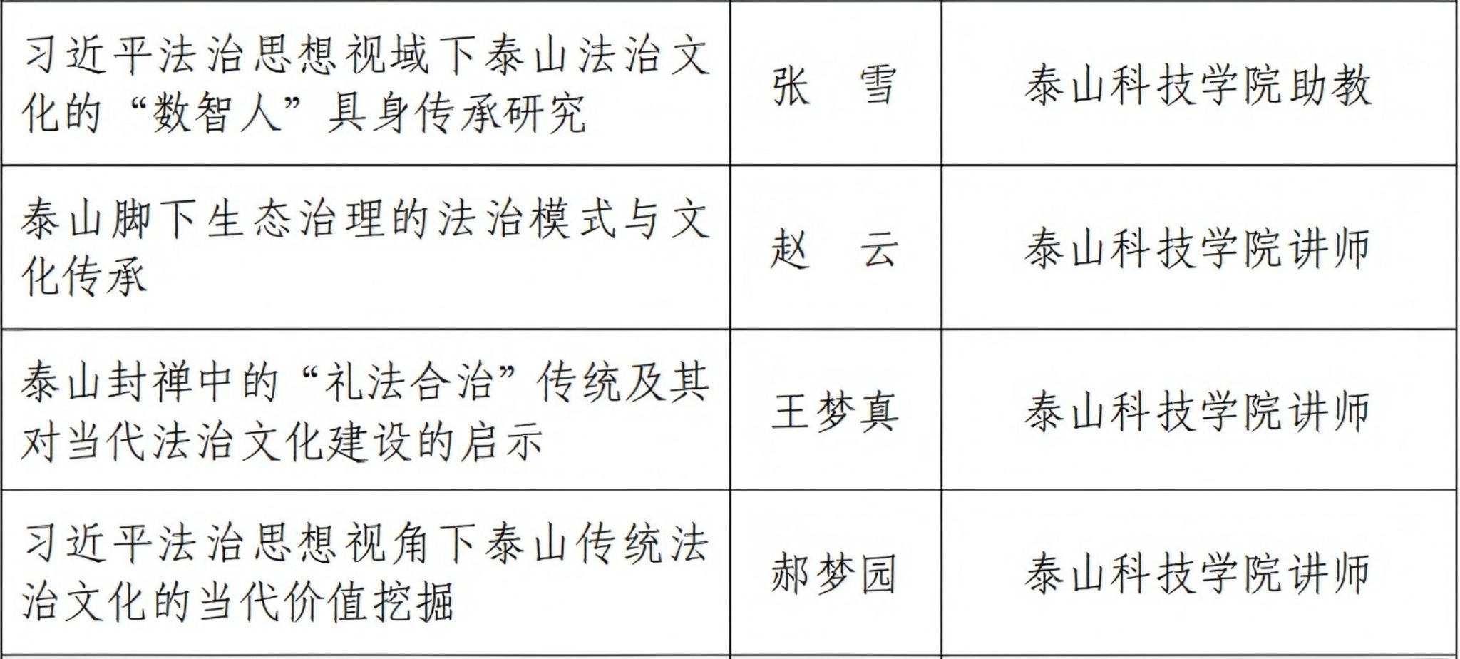 此次征文活动旨在深入学习贯彻习近平法治思想,挖掘与弘扬泰山文化中蕴含的丰富法治元素,推进法治理论与实践的本土化融合。行政管理学院法学教研室高度重视,积极组织教师结合专业方向与研究专长撰写文章。经过严格评审,其中四名老师斩获一等奖,分别为:王梦真老师的《泰山封禅中的“礼法合治”传统及其对当代法治文化建设的启示》、张雪老师的《习近平法治思想视域下泰山法治文化的“数智人”具身传承研究》、赵云老师的《泰山脚下生态治理的法治模式与文化传承》、郝梦园老师的《习近平法治思想视角下泰山传统法治文化的当代价值挖掘》。