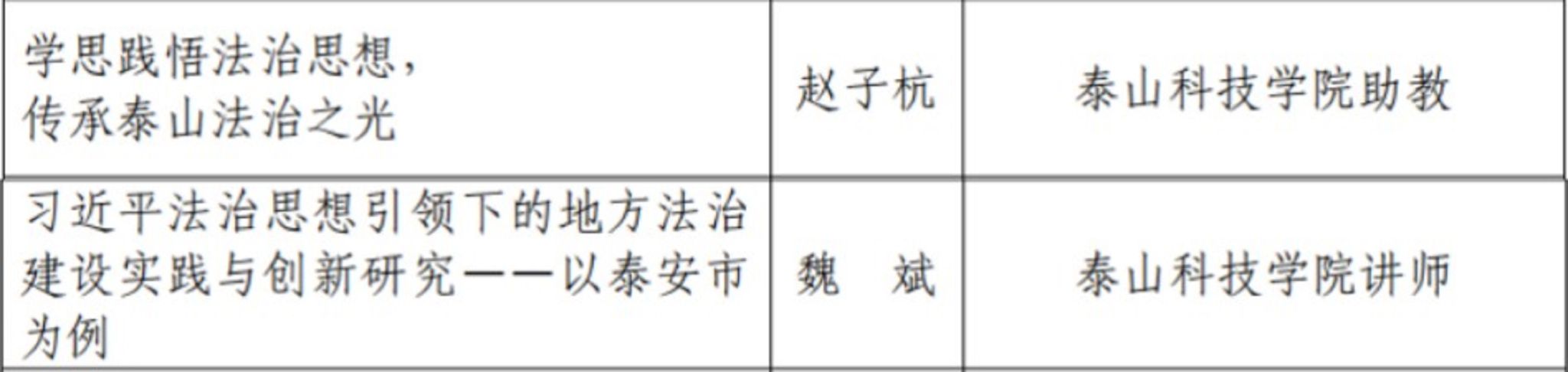 两名老师斩获三等奖,分别为:魏斌老师的《习近平法治思想引领下的地方法治建设实践与创新研究——以泰安市为例》、赵子杭老师的《学思践悟法治思想,传承泰山法治之光》。获奖论文均体现了对习近平法治思想的深刻理解,并注重从泰山地域文化中汲取法治智慧,实现了传统与现代的有机对话。