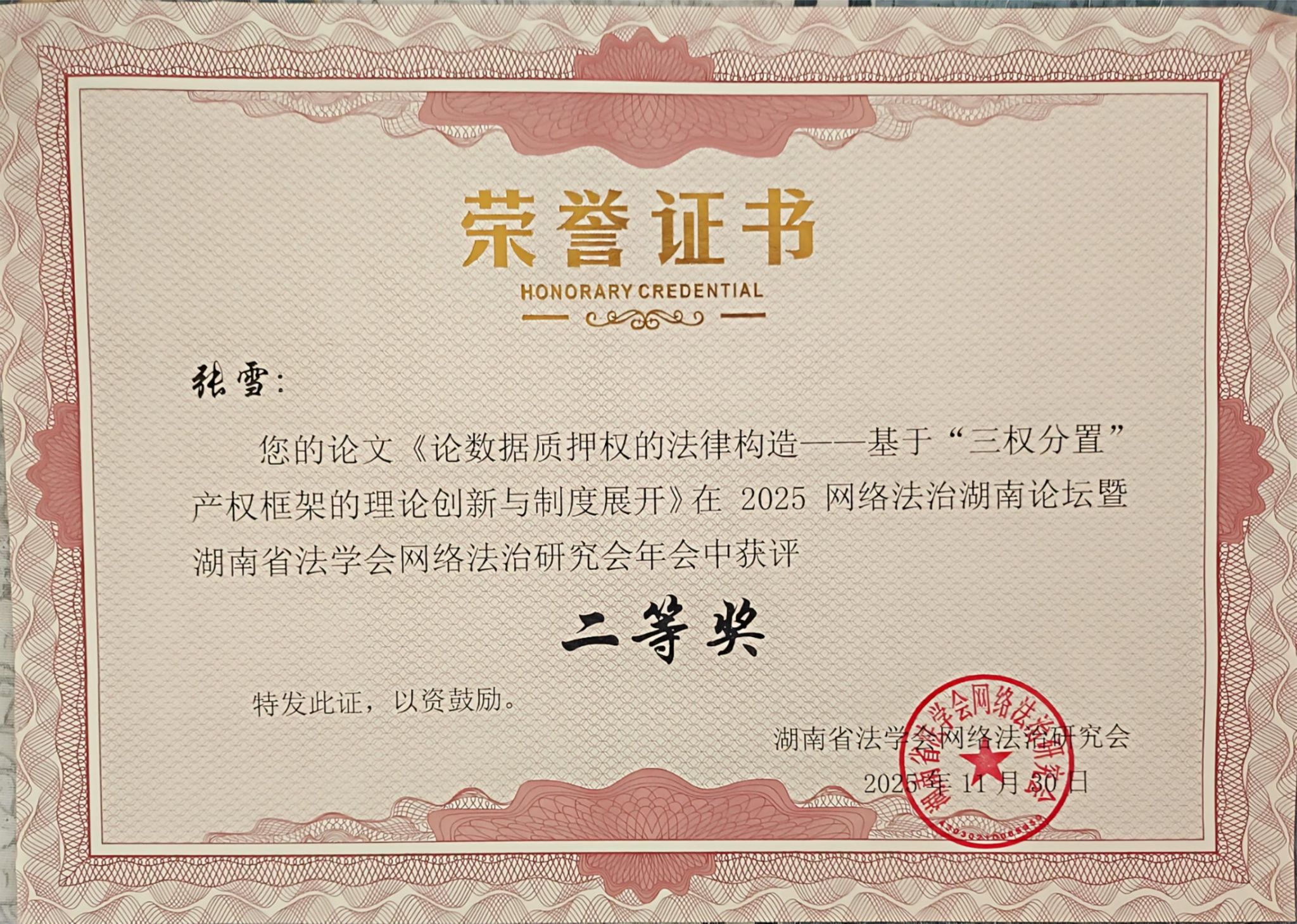 在分论坛二“网络法治理论专题”研讨环节,张雪老师以《论数据质押权的法律构造——基于“三权分置”产权框架的理论创新与制度展开》为题作主题报告。报告紧扣我国数据产权制度建设核心需求,系统论证数据质押权的主体界定、客体范围与实现路径,获得与会专家的高度评价与广泛认可。凭借该研究成果的学术价值与应用价值,张雪老师在本次年会学术论文评选中斩获二等奖。