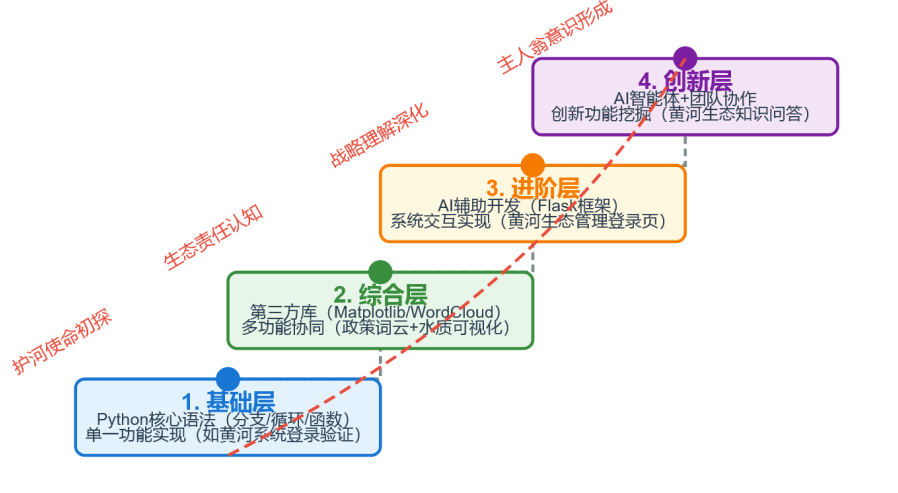 该案例以《Python语言程序设计》课程为载体,创新构建基础层—综合层—进阶层—创新层四阶教学路径,将黄河流域生态保护战略系统融入专业教学全过程。本案例设计以“Python+黄河战略案例+AI”为框架,紧扣技术能力提升与思政认知深化双目标,实现专业教育与价值引领的有机统一。教学团队整合真实水质监测数据、政策文本与AI开发工具,构建数据采集—分析可视化—系统开发—创新拓展的闭环实践场景。通过引入AI代码辅助工具,学生能在短时间内搭建具备战略主题特色的应用原型,既提升学习效率,又深化对国家战略需求的理解。